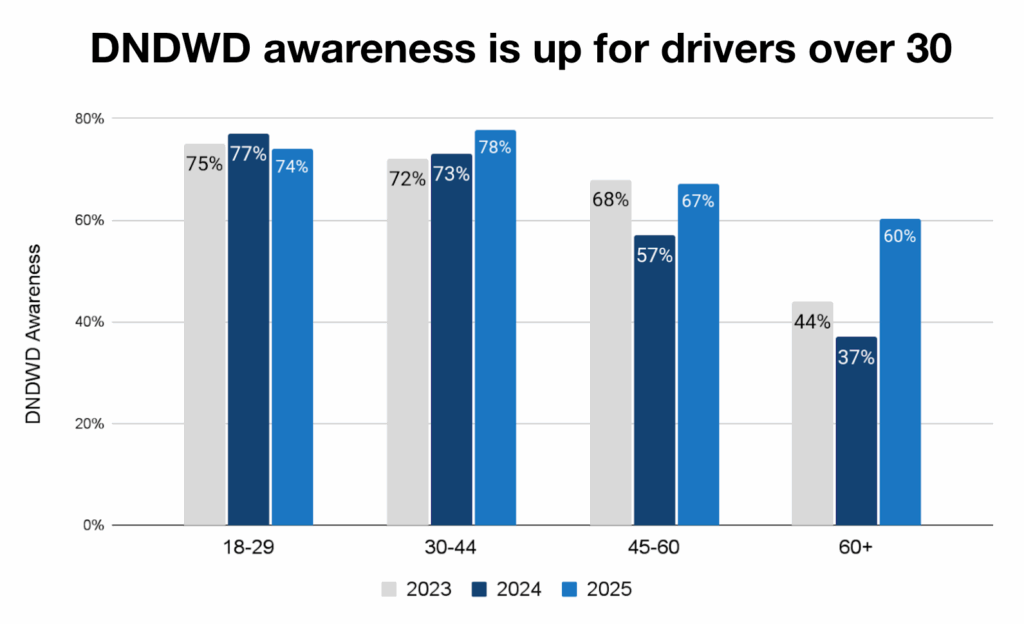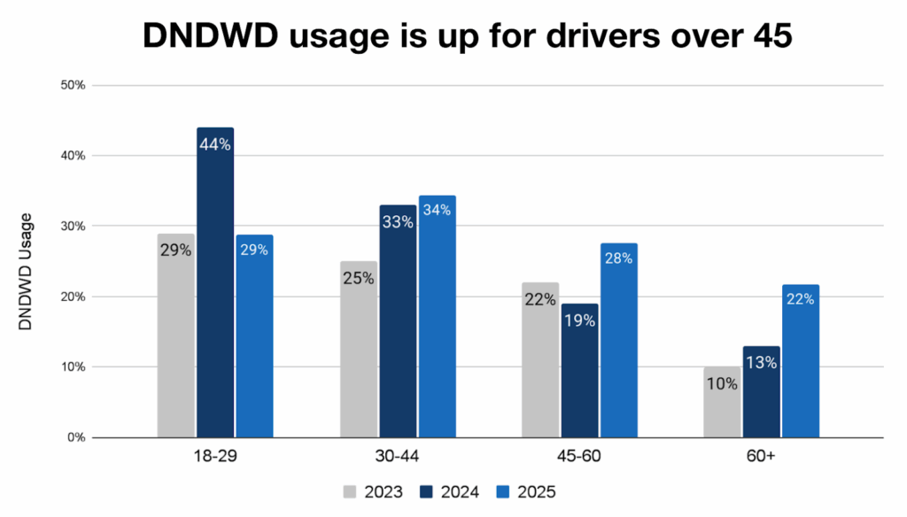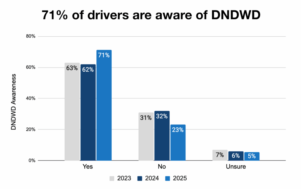 To understand the broader trends around DNDWD, we’ve been surveying drivers about their use of it over the past 3 years. The 2025 results from over 1,000 drivers tell a mixed story of progress and setbacks. Awareness has reached a new high at 71%, but usage among younger drivers aged 18 to 29 has dropped 35% from last year. The challenge now is turning growing awareness into consistent use, especially among young drivers.