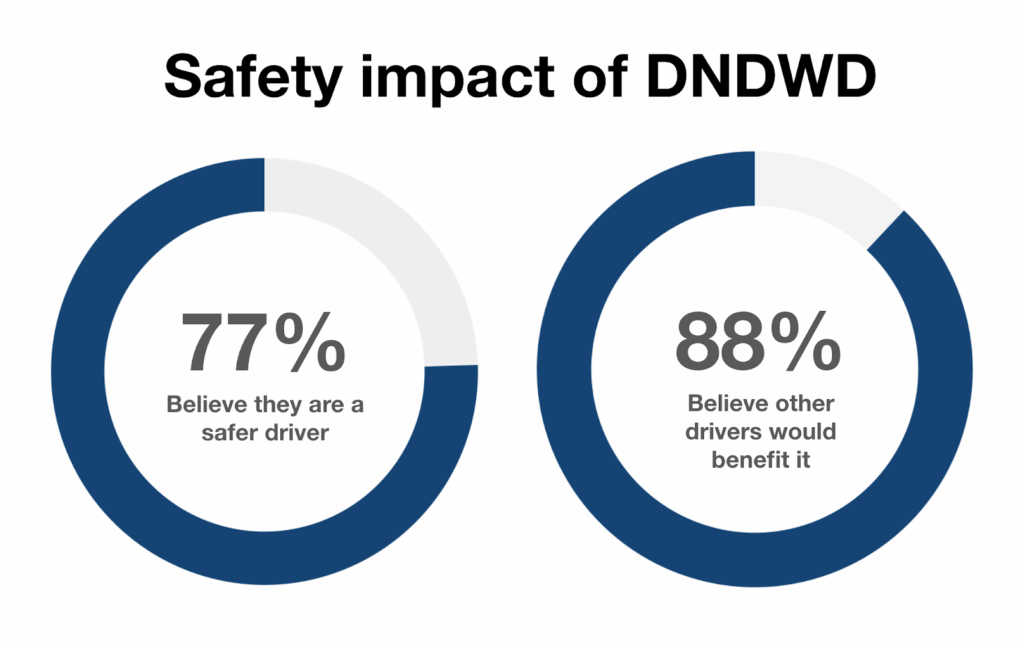 Drivers who use DNDWD share a universal belief — DNDWD is a genuine safety tool that reduces risk for both themselves and their communities. 77% say DNDWD makes them safer, and 88% believe the roads would be safer if more drivers activated it.