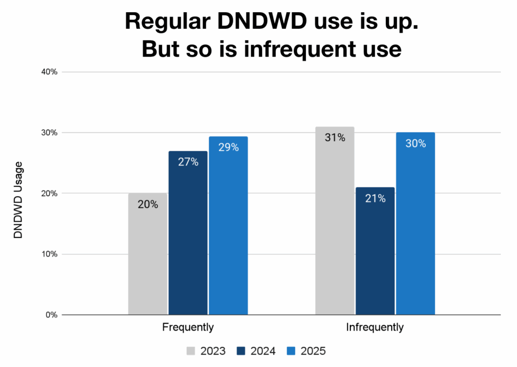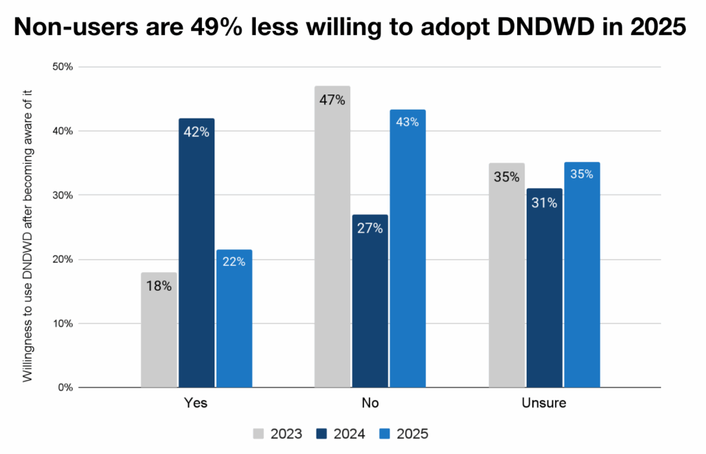 Awareness of DNDWD has climbed significantly over the past year. In 2024, 62% said they knew about the feature. In 2025, that number grew to 71% — a 15% increase.