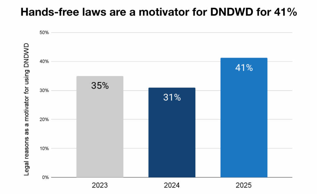 When asked why they use DNDWD, drivers consistently point to safety as their top motivation — a steady pattern over the last three years. However, State laws are also influencing drivers’ actions. In 2025, the number of drivers citing hands-free laws as a motivating factor rose by 33%, increasing from 31% in 2024 to 41% in 2025. With 31 states now enforcing hands-free laws — including new or updated legislation in 2025 in Colorado, Pennsylvania, Iowa, and Louisiana — the impact of hands-free laws on driver behavior is growing fast.