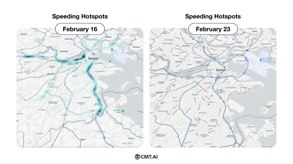 Using CMT’s AI road safety platform, we analyzed traffic volume and driving behavior in Boston and New York City on Monday, February 23, and compared the findings to the previous three Mondays in February. The results reveal just how dramatically driving patterns shifted during the storm.