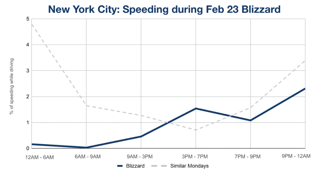 Speeding in New York followed a nuanced pattern. During the overnight and early morning hours, speeding declined 98%. From 9:00 a.m. to 3:00 p.m., speeding was down 64%. On a typical Monday, New York City drivers spend 1.27% of driving time speeding. During the blizzard, that figure dropped to 0.46%