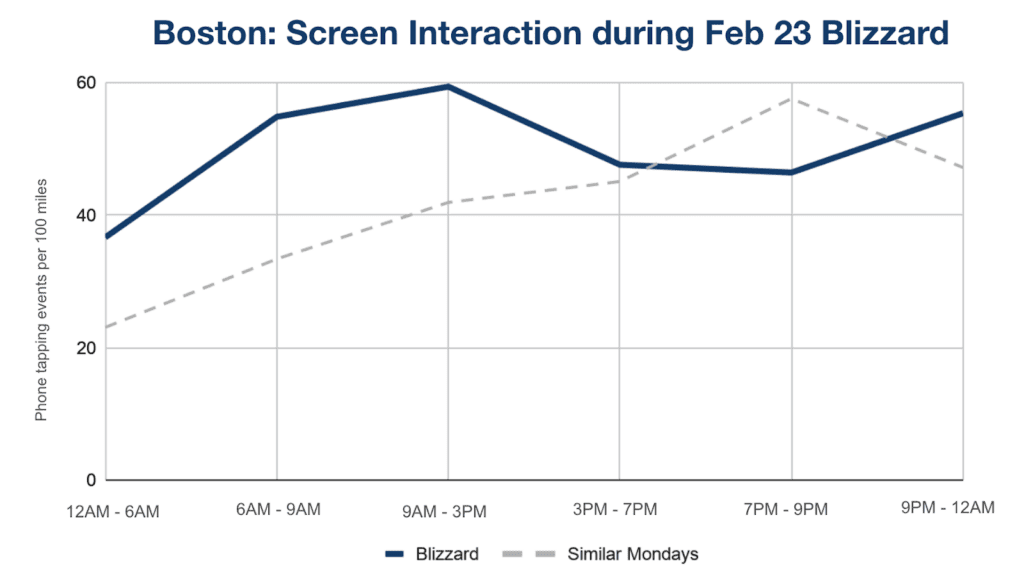 Distraction told a different story. In this analysis, distraction is measured as the number of phone tapping events per 100 miles driven. For drivers who were on the road in Boston, phone distraction increased. Overall, phone tapping events per 100 miles driven rose 18.4%. During the peak storm hours from 6:00 a.m. to 9:00 a.m., distraction surged 64.2%. From 9:00 a.m. to 3:00 p.m., distraction remained elevated at 41.7%. During this period, drivers typically experience 42 phone tapping events per 100 miles. During the blizzard, that figure rose to 59 events per 100 miles. Notably, this increase occurred with a dramatically reduced driving population. One possible explanation for the increase in distraction is that with fewer vehicles on the road and reduced visibility, drivers may have relied more heavily on navigation tools, checking for alternate routes amid road closures and rapidly changing conditions.
