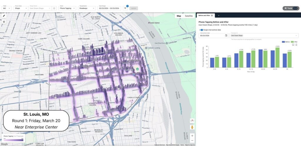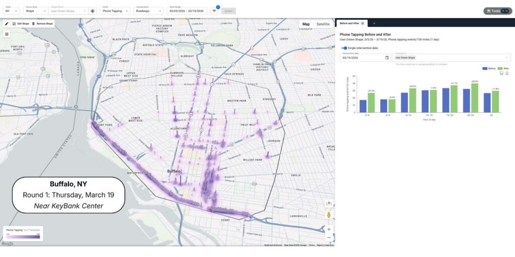 Buffalo and St. Louis saw the largest overall increases. In Buffalo, distraction rose by 14.6%, increasing from 30.9 to 35.4 phone tapping events per 100 miles. The biggest spike came during the late game window between 9:00 p.m. and 11:00 p.m., when distraction jumped by 23.3%. During that time, Michigan vs. Howard was wrapping up while Saint Louis vs. Georgia was tipping off, creating sustained, high-attention moments.
