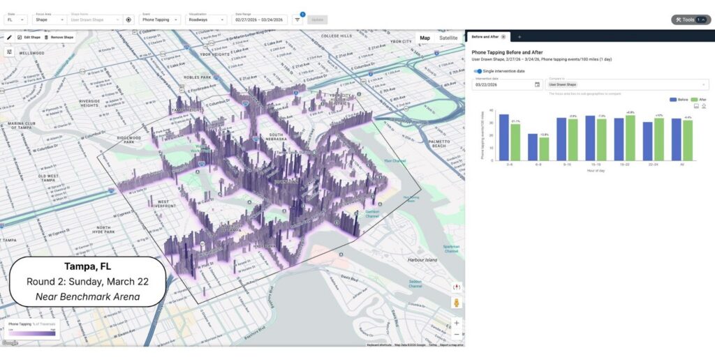 We analyzed distraction trends among drivers in host cities during the first four rounds of the NCAA Men’s Basketball Tournament, focusing on areas surrounding the arenas where games were played. We compared phone tapping events per 100 miles during game windows to similar days in surrounding weeks.